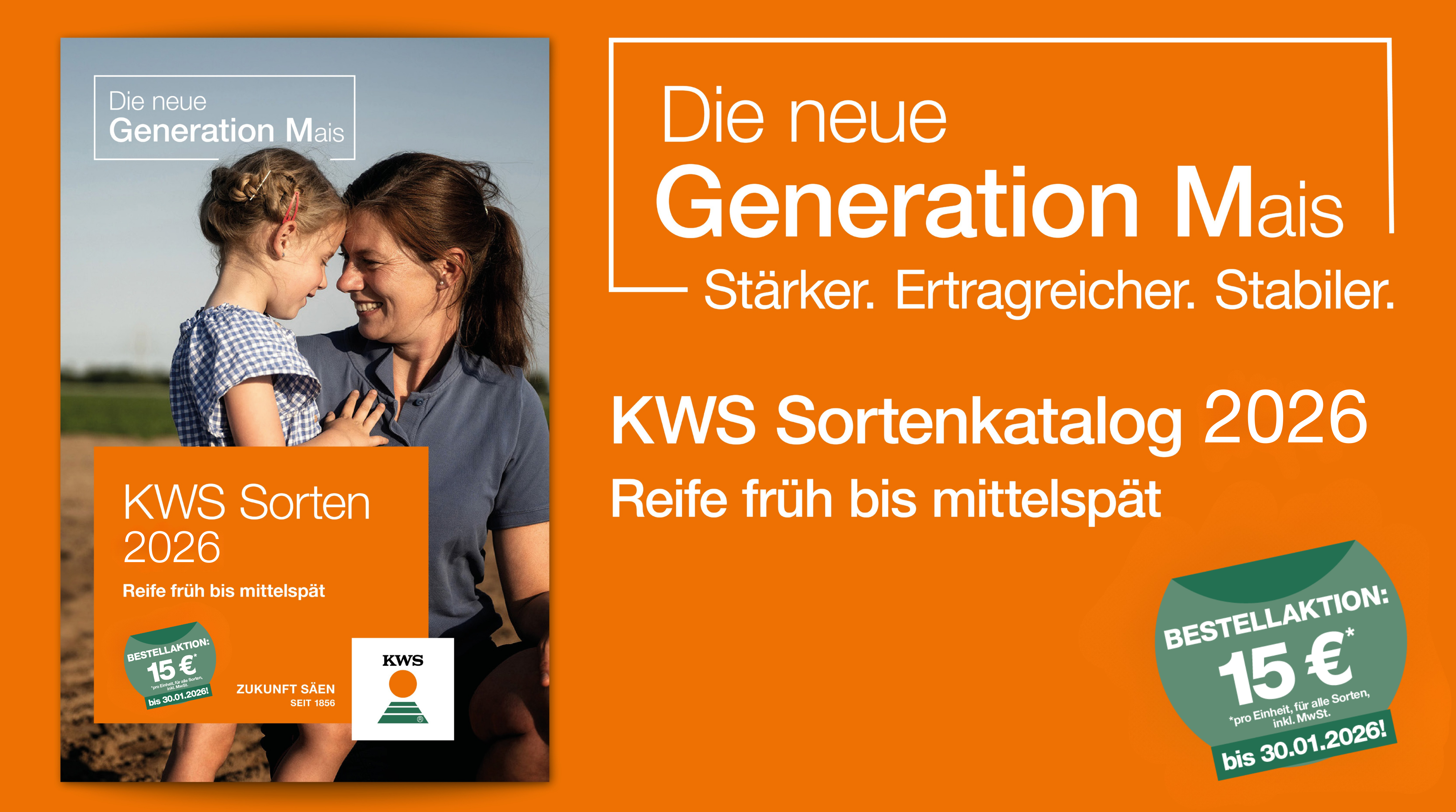 Jeder Landwirt, der seine Bestellung bis zum 31. Jänner 2026 bei seinem Handelspartner abgibt, kann pro Einheit € 15,00* sparen. Gleichzeitig sichert er sich so auch die Verfügbarkeit der leistungsstarken KWS Sorten.