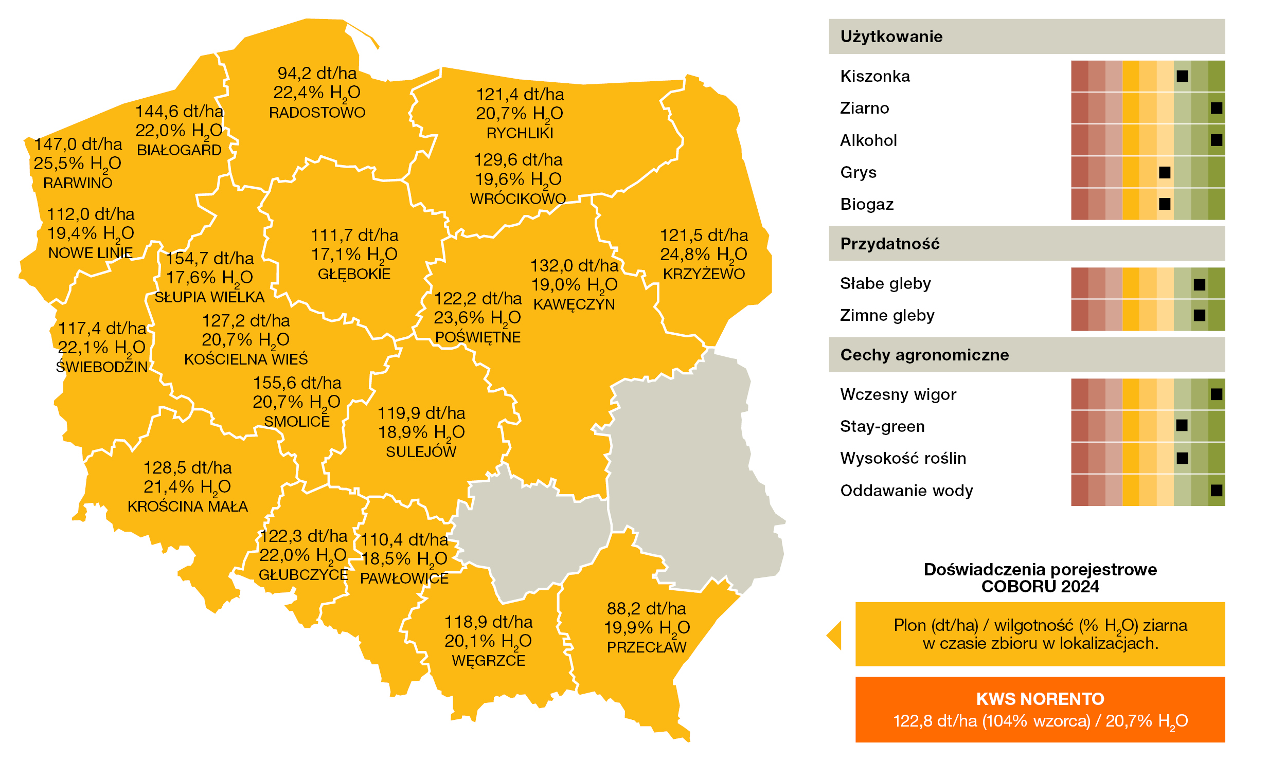 - Wysokie i stabilne rośliny o dobrej tolerancji na wyleganie.