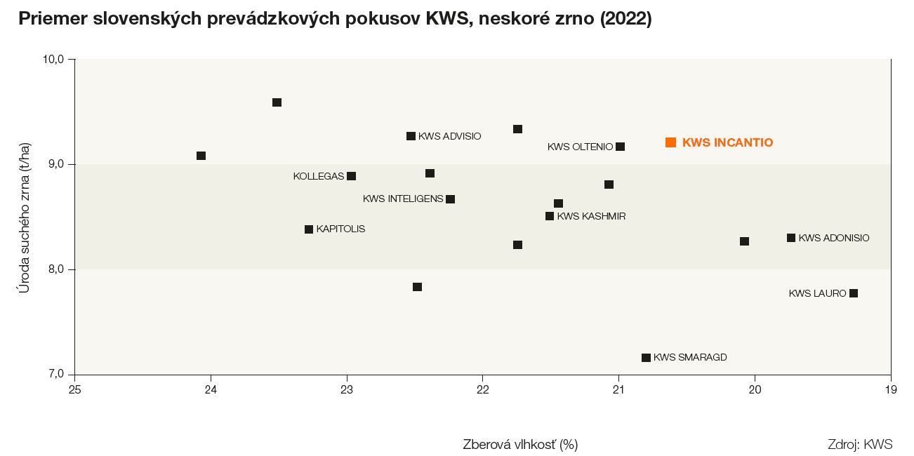 - Stredne neskorý zrnový hybrid, ktorý dosiahol v slovenských prevádzkových pokusoch v roku 2022 najlepší pomer medzi výškou úrody suchého zrna a zberovou vlhkosťou.